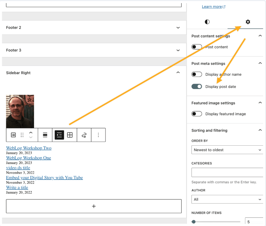 - “Latest Posts”: My Sites >> Appearance>> Widgets>>Sidebar>>Latest Posts>>Settings>>Display Post Date